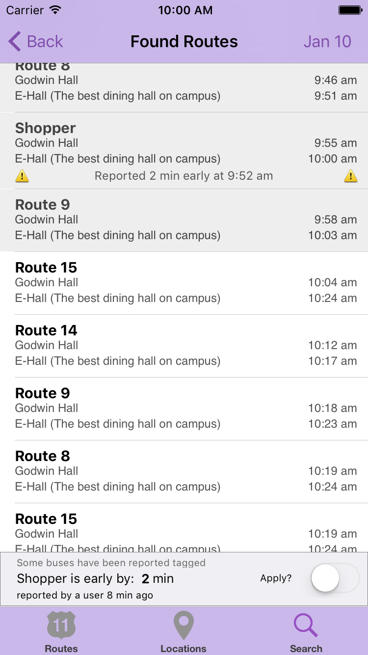 Instead of slowly and painstakingly learning the intricacies of the bus system, students just need to know where they are and where they need to go, and thanks to the GPS integration, the "where they are" became simple. Generic Locations combined tedious and convoluted locations into student-friendly names. For example, if a student was at The Quad and was trying to get to the other side of campus to the best dining hall, E-Hall, they could simply run a search for those two locations (or run it as a Saved Search and do it with a tap of the button). Without the app, the student wouldn't find either of those places in the official schedules, and instead, would need to know that the nearest bus stop going east-bound was at a residential hall named Hoffman Hall, and that the nearest stop to the dining facility was called Carrier Dr. @ Festival Conference Center.